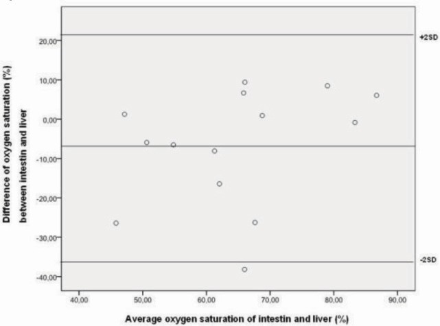 Conclusion: NIRS-measurements of intestinal and liver oxygenation values do not agree well in preterms with (suspected) NEC. Oxygenation values of these two locations can therefore not be randomly compared in clinical studies, and cannot substitute each other.