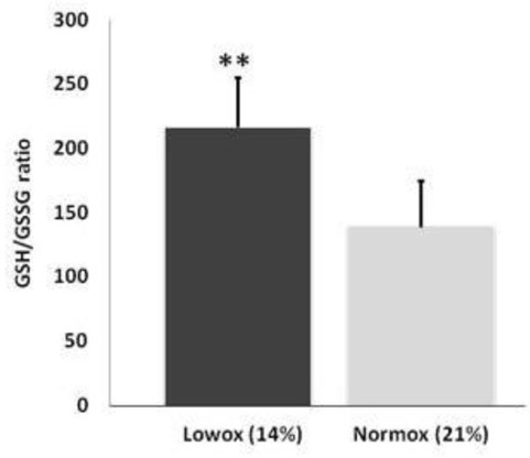 Results: Lung GSH content was significantly higher in the Lowox than in the Normox group at birth (2.88±0.24 vs. 2.28±0.23 mmol/g tissue; p< 0.05). Conversely, GSSG was lower in the Lowox group (Lowox vs. Normox: 0.015±0.004 vs. 0.116±0.004 mmol/ g tissue; p< 0.01). Hence, GSH/GSSG ratio the most relevant marker of intracellular redox status was significantly greater in the Lowox group. No differences were found for brain and gut tissue.