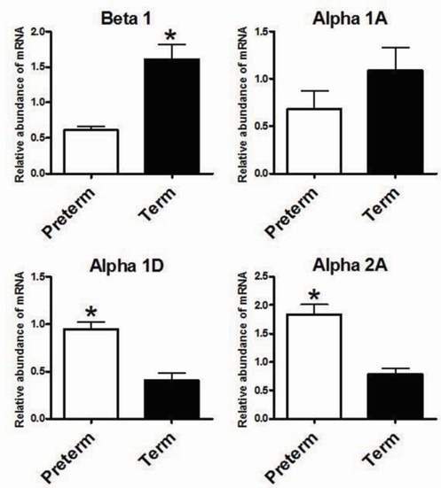 Methods: Piglets were delivered by Caesarean section at 92 days (preterm group) and 114 days of gestation (term group, full term≈115 days). mRNA levels of AR subtypes, normalised to GAPDH, were measured in left and right ventricle by real-time PCR using Taqman© chemistry (Applied Biosystems). Levels were expressed relative to a calibrator using the comparative CT method.