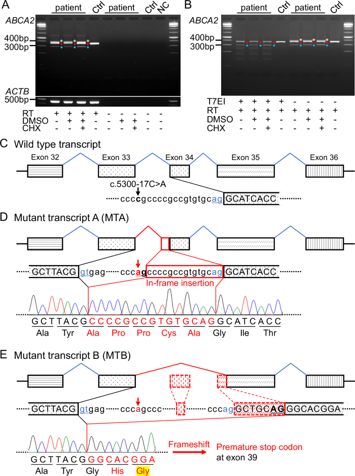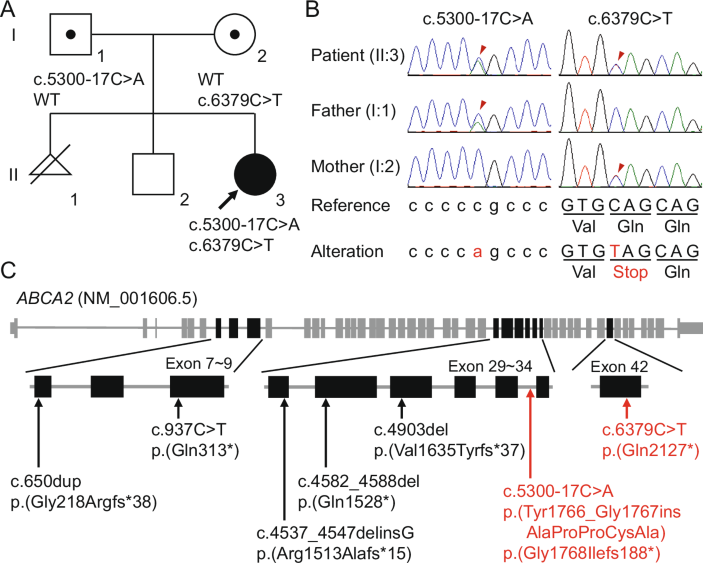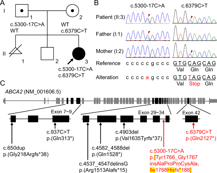 The patient variant described on pages 144–146 is accurately stated as follows: compound heterozygous ABCA2 variants, NM_001606.5:c.[5300–17C>A];[6379C>T] p.[Tyr1766_Gly1767insAlaProProCysAla,Ile1768Hisfs*188];[(Gln2127*)]