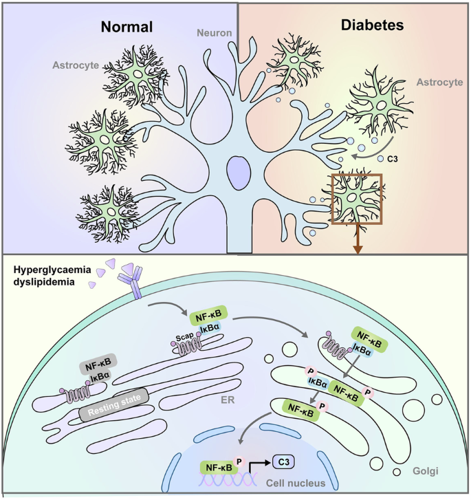 Cognitive impairment in DM often presents as reduced attention, memory, perception and executive function, leading to functional impairments and lower quality of life46,47. The key contributors include aberrant lipid metabolism, hyperglycemia and chronic neuroinflammation8,48. This Article demonstrates that elevated astrocytic SCAP expression is pivotal in astrocyte dysfunction and impaired neuroplasticity during DACI progression. The SCAP deletion in astrocytes increased astrocytic complexity in the CA3 and DG hippocampal regions, enhanced synaptic coverage, reduced astrocytic C3 levels, attenuated neuroplastic injury and improved cognitive outcomes. Mechanistically, SCAP-mediated Golgi translocation activates NF-κB, regulating neuron–glial crosstalk via the NF-κB–C3–C3aR pathway, thereby restoring neuroplasticity. These findings highlight the critical role of astrocytic dysfunction in neuronal synaptic plasticity in DACI, both in vivo and in vitro.