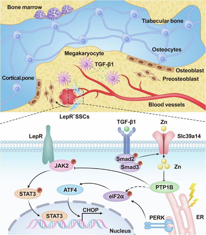 It has been reported that ER stress is associated with the pathological development of osteoporosis38. More specifically, the accumulation of unfolded or misfolded proteins can induce ER stress and cause apoptosis in osteoblasts39. Under normal circumstances, osteoblasts, chondrocytes and osteoclasts are required to continuously secrete large amounts of extracellular matrix proteins and proteases, placing a heavy protein synthesis burden on these cells, making them susceptible to ER stress. Short-term and mild ER stress can promote osteogenic differentiation of SSCs and MSCs (Mesenchymal stem cells). However, under pathological conditions, prolonged and excessive ER stress result in decreased activity and impaired osteogenic differentiation40. In the present study, we confirmed through both in vitro and in vivo experiments that TGFβ1 derived from MKs alleviates ER stress in the BM by increasing intracellular zinc ion concentrations. The zinc transporter Slc39a14 (ZIP14), a zinc importer usually located at the cell surface, is regulated by various cytokines and transcription factor41. Slc39a14 controls both physiological and pathological ER stress42. In addition, Slc39a14 can upregulate zinc levels and inhibit bone resorption in osteoclasts43. Here, we demonstrate that the levels of Slc39a14 and zinc ions are elevated in LepR+ SSCs after the addition of MKs from TGFβ1fl/fl mice, but not from TGFβ1MKΔ/Δ mice. Furthermore, we further confirmed that zinc supplementation directly alleviates ER stress and restores osteogenic potential in the context of Slc39a14 deficiency. These findings align with a previous study showing that zinc ions can further reduce ER stress levels42. Further verification of the relationship between ER stress inhibition and TGFβ1 signaling was conducted. In experiments where both 4-PBA and a TGFβ inhibitor were used, we observed no significant difference compared to the 4-PBA-only group, indicating that inhibition of ER stress effectively bypasses the negative regulation of the TGFβ1 signaling pathway (Supplementary Fig. 8h,i). This result further supports the hypothesis that ER stress is a downstream event of TGFβ1 signaling. Furthermore, our data reveal that MKs can also secret BMPs (BMP2, BMP4 and BMP6), which may directly participate in bone formation. Thus, MKs are involved in LepR+ SSCs osteogenic lineage commitment of LepR+ SSCs in the BM a process that is at least partially mediated by TGFβ1.
