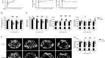 Micro-computed tomography (micro-CT) (Micro-CT Skyscan 1272 system, Bruker) with an isotropic voxel size of 5 µm was used to quantify the bone parameters of the femurs as previously described9,19. The scanning settings included a voltage of 60 kV, a current of 165 µA and a resolution of 5 µm per pixel. Reconstruction was performed using Nrecon (v1.6.10). Three-dimensional (3D) images were generated from contoured 2D images using methods based on distance transformation of the grayscale original images (CTvox, v3.0.0). The bone parameters, including trabecular bone volume fraction (BV/TV, %), trabecular number (Tb.N, 1/mm), trabecular thickness (Tb.Th, mm) and trabecular separation (Tb.Sp, mm), bone mineral density (BMD), and cortical thickness (Ct.Th, mm) were calculated using CT Analyzer (v1.15.4.0).