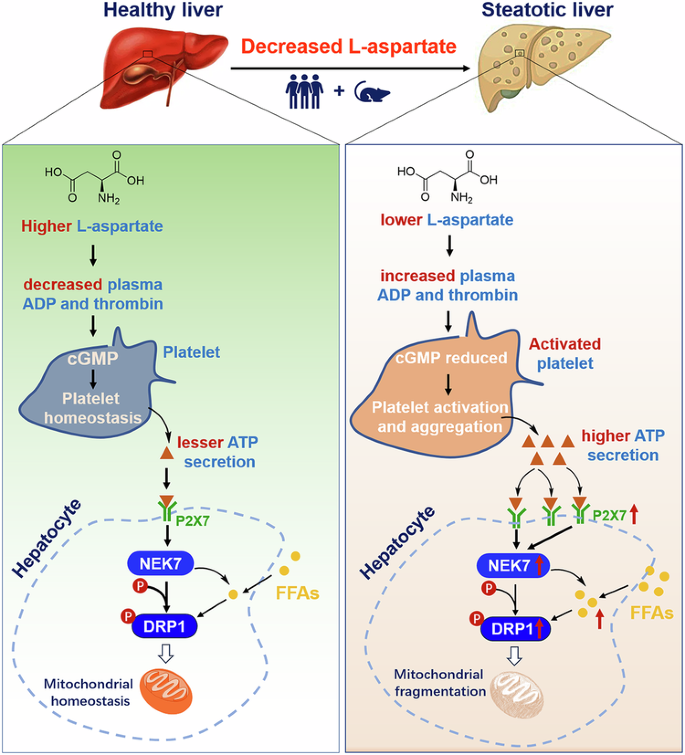 As exemplified by the approved anti-MASH agent, enhancing mitochondrial oxidation is widely recognized as a practical strategy for treating MASLD and its progressive diseases, including MASH and hepatic fibrosis13,32. The increase in the level of L-aspartate in the liver improved mitochondrial oxidation capacity, thereby counteracting liver fibrosis12,33; these findings suggest that L-aspartate is a novel metabolic regulator and potentially useful for treating MASLD and MASH. In the present study, we revealed that plasma and hepatic L-aspartate levels were decreased in mice and humans with MASLD. Using dietary approaches to determine L-aspartate availability, we provide evidence for the causative and therapeutic roles of L-aspartate against MASLD and MASH in mice. These effects are correlated with enhanced whole-body metabolic effects and improved mitochondrial quality in the liver. Mechanistically, cGMP-correlated platelet activation was correlated with the beneficial metabolic effects of L-aspartate. Notably, platelet activation-mediated ATP release followed by P2X7–NEK7–DRP1 axis activation in hepatocytes has been shown to play crucial roles in inducing mitochondrial fragmentation, lipid accumulation and hepatocyte death. Our study revealed the interactions between activated platelets and hepatocytes in driving hepatic mitochondrial dysfunction during MASLD. Moreover, our study systematically explored the therapeutic efficacy of L-aspartate against MASLD and MASH in mice, providing detailed clues for broadening its potential applications in the clinic, especially as ideal anti-MASLD agents.