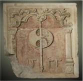 | Decorative colored stone relief, nineteenth c. CE, showing a double axe, which is possibly symbol of the Bektashi Order. Its origin is probably from a tekke. Red is the paint extensively characterizing the stone sculpture. Traces of blue, yellow and green paint as well as of a metallic foil are also visible. Dimensions: 0.50Ā ĆĀ 0.65Ā m2 |