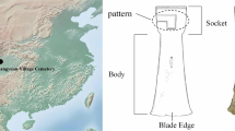 During the period of the Western Zhou Dynasty (1100-771 BC), willow-leaf bronze-shaped swords spread northward from the Chengdu Plain to the Guanzhong region. From the Spring and Autumn Period (770-476 BC) and Warring States Period (475-221 BC) to the early Western Han Dynasty (202 BC-8 AD), this type of sword radiated successively to the eastern area of the Sichuan Basin, as well as the barbarian areas in southwestern Sichuan, Yunnan and Guizhou [6, 15]. However, they are rarely found in the Central Plains. In the late Shang and Western Zhou dynasties, as wars were dominated by chariot warfare in the Central Plains, swords were mostly used as a last defense when all other weapons had failed, while they were a sign of aristocratic status. By the Spring and Autumn Period and the Warring States Period, swords gradually became combat weapons in the Central Plains due to greater flexibility and portability than other long weapons [16]. Throughout the process, the Central Plains bronze sword differs significantly from the willow-leaf shaped bronze sword. The biggest difference is that the willow-leaf shaped sword lacks a cross guard between the flat grip and the blade, and it also has no pommel. To use this type of sword, a wooden hilt would have been secured onto the short grip by an encircling cord that crosses one or two perforations on the grip [3]. Another discrepancy is that the willow-leaf shaped swords were usually cast integrally with the slender blade, while some Central Plains bronze swords used a complex process of segmented casting [17]. The willow-leaf shaped swords without the wooden hilt typically range from 20 to 30 cm in length, generally shorter than the Central Plains swords. In addition to being used as a close-quarters weapon, willow-leaf shaped swords are used in a variety of other ways. Due to the unique rugged terrain and tree-laden environment of southwest China, they are sometimes less conductive to chopping and may instead be used for throwing in battle as missile weapons. The increasing strife with outsiders has also stimulated experimentation in weapons and tactics, some modifications to meet new military situations in which willow-leaf shaped swords could even be attached to long shafts and employed as pikes [18].