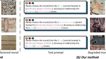 Diffusion-based methods fill missing areas by simulating the spread of pixels within an image, typically using gradient information and local features to guide the restoration process. Shen et al.7 proposed a mural restoration algorithm based on Morphological Component Analysis (MCA), inspired by the manual restoration approach for Tang dynasty tomb murals, where the global structures are addressed first, followed by local textures. The algorithm shows significant results in restoring cracks in Tang tomb murals but does not extend to murals of other styles or damage types. Jaidilert et al.8 introduced a computer aided semi-automatic repair framework. The framework involves user-provided seeds, followed by region-growing and morphological operations to identify the location of scratches, and finally applies various conventional image restoration methods such as Total Variation (TV)9, Curvature-Driven Diffusion (CDD)10, Lattice Boltzmann Method (LBM)11, and Group Sparsity Regularization (GSR)12. Chen et al.13 proposed an improved adaptive curvature-driven model for restoring Dunhuang murals. The approach addresses issues such as false edges and staircase effects in the restoration results, and uses adaptive control strategies to reduce restoration time, but is less effective when dealing with extensive irregular damage and specific mural diseases.