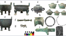 In China, the earliest known tin-covered pottery dates to late Phase IV of the Yinxu culture. Predominant vessel types include ding, gui, jue, you, gu, zun, zhi, and jia. Crafted from low-fired gray earthenware with relatively soft fabric, these artifacts meticulously replicate bronze counterparts in form, decorative motifs, and ritual assemblages, which demonstrates intentional morphological emulation (Fig. 1). Physiochemical analysis identified tin-based compounds (mainly cassiterite and romarchite), with thicknesses of 20–50 μm. The original metallic tin layer was likely applied via adhered foil cladding techniques17. Following the Shang period, such objects persisted through the Spring and Autumn, Warring States, and Han periods18. The tin-covered pottery imparts a distinctive silver-gray luster, thereby mimicking the appearance of metal ritual vessels. Essentially, while tin-covered pottery served functionally equivalent roles to bronze ritual vessels in pre-Qin mortuary contexts, the application of tin surfacing enhanced their visual resemblance to metallic objects. Through ritual assemblages, notably ding and gui vessels, these tin-covered pottery replicated the ceremonial significance of bronze ritual paraphernalia.