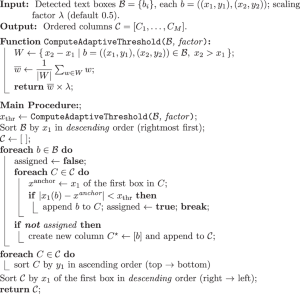 At inference, the detected boxes are first passed to the recognition model to obtain character predictions, after which Algorithm 1 adaptively estimates a horizontal threshold and clusters the boxes into right-to-left columns with top-to-bottom ordering, following the conventional reading direction of Western Zhou BIs47. This procedure produces a structured full-page transcription result.