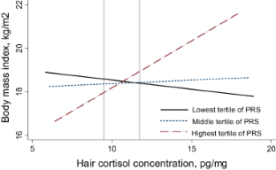 Data were analyzed from an established prospective puberty cohort in Anhui province, China. A total of 1000 children (421 boys and 579 girls, mean (standard deviation) age 8.97 (0.86) years) who had complete DNA genotyping, hair cortisol concentration and BMI were eligible for the study. The polygenic susceptibility score (PSS) was computed based on 11 SNPs derived from a published genome-wide association study for child obesity.