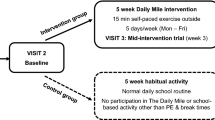 Implementation was pragmatic to fit around the school annual timetable including school vacation. Schools were provided with information regarding The Daily Mile and directed to The Daily Mile website [10] for further guidance and resources. The intervention was carried out in lesson time at a time to suit each class during the school day, children left the classroom to run or walk around a pre-defined route within the school grounds for 15 min (on average equivalent to a distance of around 1 mile). The intervention was carried out in all but severe adverse weather conditions and required no change of clothing or footwear and was not a substitute for PE or break-times. Whilst advised as a daily activity, the frequency and duration were at the class teacher’s discretion. Although intervention development was not theoretically informed a priori, several characteristics were in keeping with established behaviour change theory and evidence-based techniques. These include promotion of autonomy (empowering children to set their pace and teachers to choose when and how to run the programme), engendering a sense of belonging (inclusive of all children, connecting with others and their teachers) and promoting achievement of competence (simple skill that is easily achieved and sufficiently challenging). Furthermore, class teachers delivered the intervention and were permitted to adapt it for implementation, using motivational material such as certificates, or using it to facilitate learning within another subject area such as Maths.