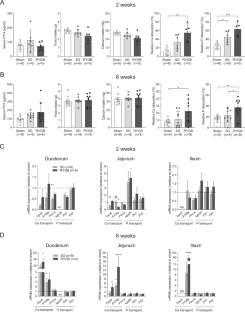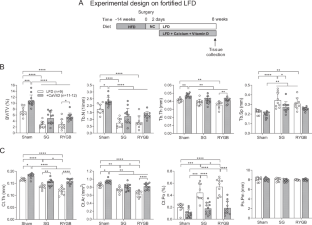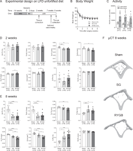 We used mouse models for SG and RYGB and compared bone loss with a group of sham mice with similar weight loss. All groups were switched at the time of surgery to a low-fat diet (LFD). We also examined whether fortification of the diet with calcium citrate and vitamin D was able to prevent bone loss.