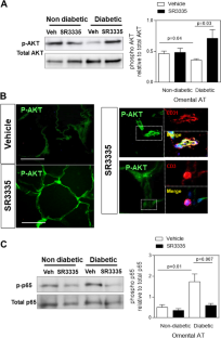 RORα expression was significantly higher in omental AT than in subcutaneous AT (p = 0.03) and was positively associated with BMI (r = 0.344, p = 0.027) and homeostasis model assessment of insulin resistance (r = 0.319, p = 0.041). In ex vivo assays, IL-8/CXCL8 and MCP-1/CCL2 chemokine release was significantly higher in omental fat explants from diabetic patients than from non-diabetics and was significantly diminished by RORα blockade (p < 0.05). Inhibition of RORα improved protein kinase B signaling and decreased NF-κB activity in omental AT from patients with diabetes (p < 0.05). Under dynamic flow conditions, RORα blockade prevented mononuclear cell attachment to human dysfunctional endothelial cells.