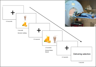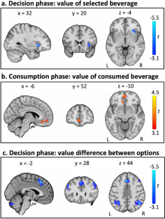 After overnight fasting, 26 individuals (BMI: 18–40 kg/m2) performed a food choice task while being scanned with functional magnetic resonance imaging (fMRI). Each trial involved selecting one beverage from a pair of presented options, followed by delivery of a 3 mL aliquot of the selected option using an MR-compatible gustometer. We also tracked subjective preference for each beverage throughout the experiment.