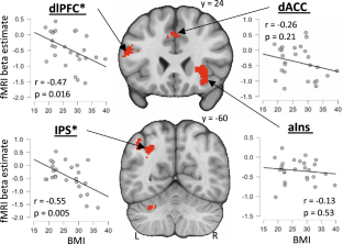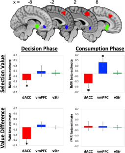 During food choice, individuals with greater BMI had less activation in the dorsolateral prefrontal cortex when selecting a high-value option and less vmPFC activation upon its consumption. Independent of BMI, during food choice the dACC and anterior insula elicited higher activation when a less preferred beverage was selected. Activation of the dACC and a broader frontoparietal network was also observed when deciding between options more similar in value. During consumption, receipt of a more preferred beverage was associated with greater vmPFC response, and attenuation of the dACC.