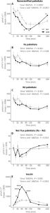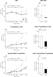 There was a tendency toward reduced fasting plasma nonesterified palmitate concentrations after RYGB, but neither fasting palmitate kinetics nor fasting triacylglycerol (TAG) concentrations changed compared with before surgery. Postprandial TAG concentrations were numerically, but nonsignificantly, reduced 3−4 h after meal intake after compared with before RYGB. However, the postprandial appearance of the oral palmitate tracer in the plasma TAG pool and overflow into the nonesterified palmitate pool were initially faster but overall reduced after RYGB by 50% (median, IQR: [47;64], P = 0.004) and 46% (median, IQR: [33;70], P = 0.041), respectively. The maximal postprandial suppression of plasma nonesterified palmitate concentrations was slightly greater but shorter lasting after RYGB ('time × visit' interaction: P < 0.001), without detectable effects of surgery on the rate of appearance and disappearance of plasma palmitate.