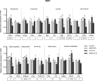 GSPE consumption at ZT0 was associated with a potential antidiabetic effect without affecting adiposity and energy intake and downregulating the gene expression of inflammatory markers in EWAT. In contrast, GSPE consumption at ZT12 improved adipose tissue expansion decreasing adipocyte size in IWAT. In accordance with this adipogenic activity, the expression of genes involved in fatty acid metabolism were downregulated at ZT12 in IWAT. In turn, GSPE consumption at ZT12, but not at ZT0, repressed the expression of the clock gene Cry1 in IWAT.