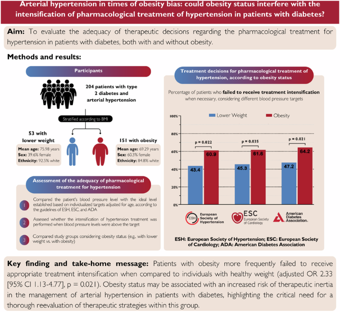 This is a multicentric cross-sectional study of patients with type 2 diabetes and arterial hypertension who received outpatient care in Southern Brazil. Participants were stratified into two groups according to their body mass index (BMI): lower weight (BMI < 25.0 kg/m2) and with obesity (BMI ≥ 30.0 kg/m2). The primary outcome evaluated was the difference in pharmacological treatment decisions for hypertension between groups, considering individualized hypertension targets from American Diabetes Association (ADA), European Society of Hypertension (ESH), and European Society of Cardiology (ESC) guidelines. Data were analyzed as a binary endpoint (failure to receive treatment intensification vs. receiving treatment intensification when necessary) and groups were compared using multivariable logistic regression.