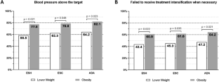 This study included 204 participants, of which 53 were at a lower weight and 151 had obesity. Patients with obesity more frequently failed to receive appropriate treatment intensification when compared to individuals with lower weight. The differences between the study groups were observed when considering the blood pressure target of three societies: ESH (adjusted OR 2.28 [95% CI 1.12–4.63], p = 0.022), ESC (adjusted OR 2.13 [95% CI 1.05–4.31], p = 0.035), and ADA (adjusted OR 2.33 [95% CI 1.13–4.77], p = 0.021).