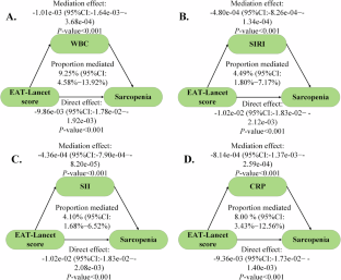 Among the 9672 participants, 910 (9.41%) were identified with sarcopenia, and 607 (6.28%) were identified with sarcopenic obesity. After adjusting for potential confounders, the odds ratios (OR) and 95% confidence intervals (CI) for sarcopenia and sarcopenic obesity in the highest quartile groups were 0.72 (0.54–0.95) and 0.58 (0.42–0.82), respectively, compared to those in the lowest quartile group. A 10-point increase in the EAT-Lancet diet score was significantly associated with a reduced risk of sarcopenia and sarcopenic obesity, with OR (95% CI) of 0.90 (0.84–0.98) and 0.86 (0.79–0.93), respectively. Furthermore, white blood cell count demonstrated the strongest mediating effect on this association, followed by C-reactive protein, systemic inflammation response index and systemic inflammatory index.