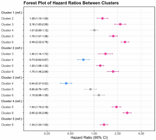 In a total of 4938 ADs incidence events over a mean follow-up of 13.3 years, participants in Cluster 6 (clinical obesity at baseline; HR = 2.48, 95% CI: 2.222.78) and Cluster 3 (non-obesity and dysfunction at baseline; HR = 2.16, 95% CI: 1.83–2.55) exhibited the highest multivariable-adjusted mortality risk compared with participants without obesity and dysfunction at baseline and during follow-up (Cluster 1). Specific ADs analyses showed consistently higher incidence risks in Cluster 6, notably in PSO and PRA (HR = 4.31, 95% CI: 3.58–5.19 and HR = 3.63, 95% CI: 2.54–5.18, respectively).