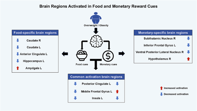 We systematically reviewed 26 studies with 1065 participants, comprising 6 monetary reward and 20 food reward studies. Overlapping reduced activation occurred in the left posterior cingulate cortex (PCC) and insula across both reward types; the left middle frontal gyrus (MFG) exhibited decreased activation in response to food reward cues, while it showed increased activation in response to monetary reward cues in individuals with OW/OB. During food-reward tasks, individuals with OW/OB exhibited increased activation in the bilateral caudate nucleus, hippocampus, anterior cingulate cortex (ACC), and medial prefrontal cortex, alongside decreased activation in amygdala responses. For monetary-reward tasks, increased activation was observed in the right lateral nucleus and hypothalamus, while decreased activation was observed in the right subthalamic nucleus (STN) and posterior ventral lateral nucleus.