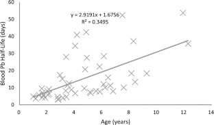 Childhood lead exposure has been shown to have a significant effect on neurodevelopment. Many of the biokinetics involved with lead biomarkers in children still remain unknown. Two hundred fifty (157 in the exposed group and 93 controls) children were enrolled in our study and lead exposed children returned for multiple visits for measurement of blood and bone lead and chelation treatment. We demonstrated that the correlation between blood and bone lead increased with subsequent visits. We calculated the blood lead half-life for 50 patients, and found a significant (p-value < 0.001) positive correlation with age. For ages 1–3 years (N = 17), the blood lead half-life was found to be 6.9 ± 4.0 days and for 3+ years it was found to be (N = 33) 19.3 ± 14.1 days. In conclusion, the turnover of lead in children is faster than in adults. Our results indicate that blood lead is a more acute biomarker of exposure than previously thought, which will impact studies of children’s health using blood lead as a biomarker.