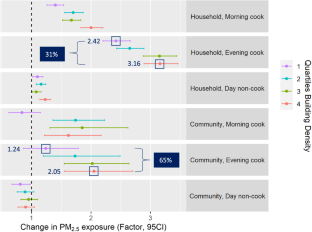 Relative to nighttime household exposure, PM2.5 exposure during evening cooking hours was 2.84 (95%CI = 2.70–2.98) and 1.80 (95%CI = 1.54–2.10) times higher in the household and community, respectively. Exposures were elevated in areas with the highest versus lowest quartile of building density (FactorQ1vsQ4 = 1.60, 95%CI = 1.42–1.80). The effect of building density was strongest during evening cooking hours, and influenced levels in both the household and community (31% and 65% relative increase from Q1 to Q4, respectively). Being proximal to a trunk, tertiary or track roadway increased exposure by a factor of 1.16 (95%CI = 1.07–1.25), 1.68 (95%CI = 1.45–1.95) and 1.27 (95%CI = 1.06–1.53), respectively.