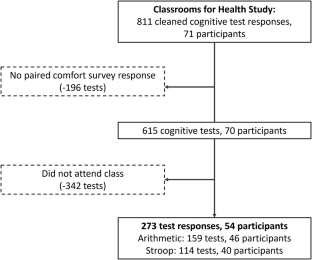 Post-class cognitive performance tests (Stroop, assessing inhibitory control and selective attention; Arithmetic, assessing cognitive speed and working memory) were administered through a smartphone application to participating students (54 included in analysis) over the 2022–2023 academic year in classrooms equipped with continuous indoor environmental quality monitors that provided real-time measurements of classroom carbon dioxide concentrations. Temporally and spatially paired exposure and outcome data was used to construct mixed effects statistical models that examined different carbon dioxide exposure metrics and cognitive test scores.