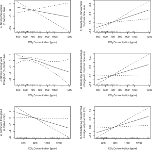 Model estimates show directionally consistent evidence that higher central and peak classroom carbon dioxide concentrations, indicative of ventilation and occupancy, are associated with lower cognitive test scores over the measured range included in analysis ( ~ 440–1630 ppm). The effect estimates are strongest for 95th percentile class carbon dioxide concentrations, representing peak class carbon dioxide exposures.