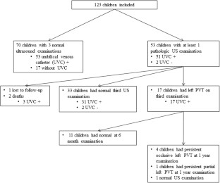 Seventy neonates (57%) had three normal US examinations. Fifty-three neonates (43%) had a clinical and biological asymptomatic left PVT. No right or extrahepatic portal venous thrombosis was observed. Umbilical vascular catheter (UVC) was removed in case of PVT. No anticoagulation therapy was required. No risk factor was significantly associated with PVT. At 1 year of follow-up, five infants had persistent isolated left PVT (4%).