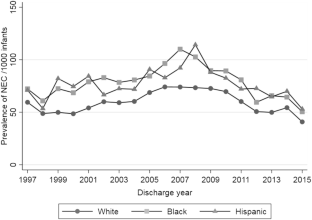 Of the 126,089 (45% non-Hispanic White, 27% non-Hispanic Black, and 19% Hispanic) infants who met the inclusion criteria, 8796 (7%) developed NEC. On multivariable analysis, non-Hispanic Black and Hispanic infants had higher odds of developing NEC (AOR 1.31, 95% confidence interval (CI) [1.24–1.39], p < 0.001 and AOR 1.30 [1.21–1.39], p < 0.001, respectively). Among infants with NEC, mortality was higher in non-Hispanic Black and Hispanic infants compared to non-Hispanic White infants (AOR 1.35 [1.15–1.58], p < 0.001 and AOR 1.31 [1.09–1.56], p = 0.003, respectively).