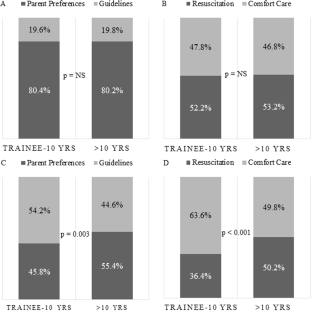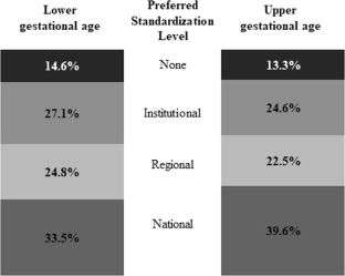 Most of the 480 respondents desired standardized guidelines for upper (85%) and lower (87%) gestational age limits for offering resuscitation and comfort care. Standardization was most to least frequently desired at the national, institutional, and regional levels. Within scenarios involving parents’ preferences conflicting with institutional guidelines, respondents chose parent-preferred options more often (66 vs. 34%). Overall, resuscitation (48%) versus comfort care (52%) were nearly equally chosen. In emergency scenarios, more versus less experienced respondents favored parent-preferred options over guidelines (55 vs. 46%, p = 0.003) and chose resuscitation over comfort care (50 vs. 36%, p < 0.001).