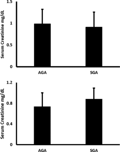 Fifty (25 SGA and 25 AGA) infants were included. On day of life 1, SGA group had higher serum sodium, serum urea, and urinary creatinine. On day 5, SGA infants had significant increase in serum creatinine (p = 0.04). Urinary NAG and FeNa were comparable among the two groups on days 1 and 5.