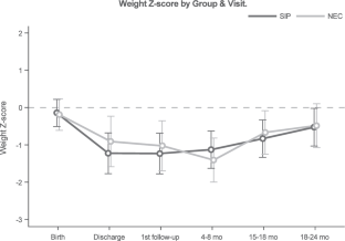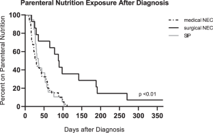 In a retrospective cohort study, linear mixed models were used to compare growth outcomes from birth to 24 months corrected age for very low birth weight (VLBW) infants with surgical NEC to those with spontaneous intestinal perforation (SIP). Kaplan-Meier curves were developed to demonstrate the duration of parenteral nutrition (PN) use.