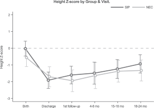 Height differed by surgical NEC and SIP over time (interaction p = 0.03). Surviving infants with surgical NEC had lower head circumference z-scores at 24 months. Of infants surviving surgical NEC, 71% received PN for >60 days after diagnosis.