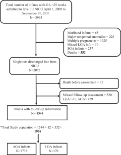 To compare neurodevelopmental outcomes of large and appropriate for gestational age (LGA, AGA) infants <29 weeks’ gestation at 18–24 months of corrected age.