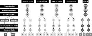 In 2015, we implemented a clinical practice guideline promoting SDM use within antenatal consultations in our single-centre university-based perinatal unit. We conducted a prospective cohort study with a retrospective chart review based on data collected from all pregnant women presenting to obstetrical triage between 22 + 0 and 25 + 6 weeks gestation between September 2015 and June 2018.