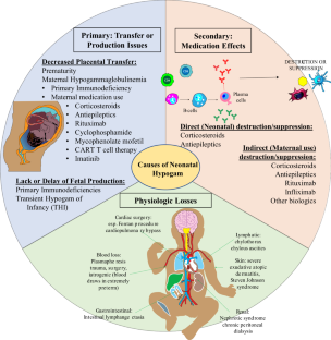 This article presents a review of causes of hypogammaglobulinemia in neonates utilizing illustrative cases to demonstrate commonly seen conditions. Overall, the causes of low immunoglobulin level can be divided into three main categories: decreased maternal transfer or production (due to physiological nadir, transient hypogammaglobulinemia of infancy, medication effects, or immunodeficiency), increased loss of immunoglobulins (from the gastrointestinal (GI) system, lymphatics, kidneys, skin disease, or blood loss) or destruction/suppression (from medication effects). Treatment of hypogammaglobulinemia is generally tailored to the underlying cause and condition of the patient. This can be through supportive care, prophylactic measures, or with immunoglobulin G (IgG) replacement at the recommendation of an immunologist.