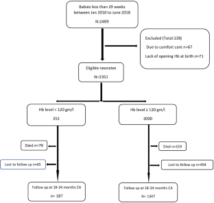 To compare neurodevelopmental outcomes at 18–24 months corrected age (CA) for preterm infants who had hemoglobin levels <120 g/l versus those with hemoglobin level ≥120 g/l at birth.