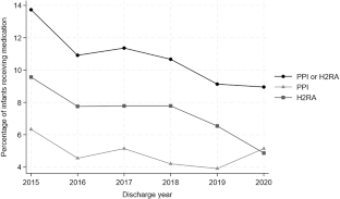 Of 13,735 infants meeting inclusion criteria, 11% were exposed to acid-suppressive therapy during hospitalization, with 3% of those treated on the day of discharge. Exposed infants had lower birthweights (BW) (p < 0.001). 42% of infants exposed to acid-suppressive therapy received a gastroesophageal reflux disease (GERD) diagnosis (p < 0.001). Median (25th–75th percentile) duration of use was 7 (4–14) days. Use decreased overall during the 5-year period (p < 0.001).