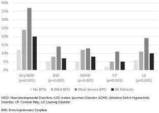 Bronchopulmonary dysplasia (BPD) is associated with poor cognition. The association between BPD severity and neurodevelopmental disorders (NDD) has not been explored. We hypothesized increasing BPD severity is associated with increased risk of NDD.