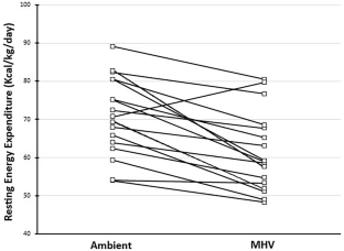 Among 34 measurements from seventeen subjects, REE was significantly lower during MHV exposure compared to ambient noise (61.4 ± 10.3 vs. 70.9 ± 10.3 kcal/kg/day, p = 0.0001). Mean heart rate was also significantly lower with MHV (144 ± 13 vs. 150 ± 11 bpm, p = 0.028), with no differences in other vital signs.