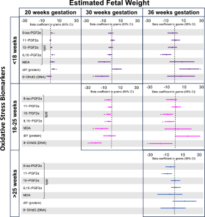 Among 1408 participants, oxidative stress biomarkers of lipid peroxidation and DNA damage were associated with smaller estimated fetal weight at 30 and 36 weeks (ranging from B = –3.9 grams/unit increase [95% CI: –6.9, –0.9; 8,15 − PGF2α] to –20.3 [95% CI: –27.9, –12.8; 8 − OHdG]), particularly among fetuses at the 25th percentile. Oxidative stress biomarkers of protein damage were associated with larger estimated fetal weight at 20 (3.4 [95% CI: 1.2, 5.7]) and 36 weeks (16.5 [95% CI: 5.2, 27.8]).