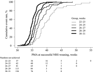 The median PMA at successful weaning was 36.0 weeks. PMA at successful weaning was negatively correlated with GA. Only a small number of infants with earlier GA achieved successful weaning before 36 weeks of PMA. Earlier GA, small for GA, bubbly/cystic appearance on X-rays, and bowel perforation with ileostomy were identified as risk factors for delayed weaning.