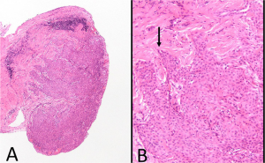 Churg et al. report nine examples of a previously undescribed type of peritoneal circumscribed nodular mesothelial tumor characterized by nests or sheets of mesothelial cells with sharp cell borders and extremely bland, sometimes grooved, nuclei. All the patients were women, age range 30 to 72 years (median 52). All tumors were incidental findings during surgery. The cases were referred in consultation, and the referring pathologists usually raised a question of mesothelioma. RNA sequencing revealed that these tumors clustered together and were distinct from peritoneal diffuse malignant mesotheliomas. Very few mutations or translocations were found, and no tumor showed an abnormality in any of the genes typically mutated/deleted in diffuse malignant mesothelioma. On follow-up (range 5–60 months, median 34) there were no deaths, no recurrences, and no evidence of metastatic disease or local spread. The authors propose the name “solid papillary mesothelial tumor” for these lesions. They appear to be either benign or very-low-grade tumors that need to be distinguished from malignant mesotheliomas.
