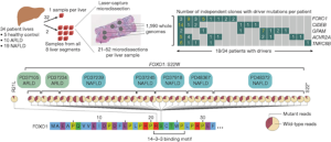Exploring the acquisition of somatic mutations that take normal liver toward liver disease and on to hepatocellular carcinoma involved analyzing somatic mutations from 1590 genomes in liver samples. Ng and co-workers found that 7 of 29 patients with liver disease had single hotspot mutations in FOXO1, the major transcription factor in insulin signaling, affecting the nuclear export of FOXO1. Six of seven of these patients with FOXO1x22W hotspot mutations showed convergent evolution, with variants acquired independently by up to nine distinct clones per patient. The same convergent evolution with up to 14 independent clones per patient exhibited CIDEB mutations and up to seven clones per patient exhibiting GPAM mutations. Somatic mutations in these genes protect hepatocytes from lipotoxicity. The mutations were in multiple anatomical locations within the liver, increased clonal size, and were found in multiple iterations of liver disease but rarely hepatocellular carcinoma. Within the liver of one patient, the authors observed many independent hepatocyte clones preferentially expanding with mutations in the same metabolism gene. Such convergent evolution points to highly specific selective pressures. While larger studies are needed to explore this heterogeneity, the results suggest that genomic data could be used for predictions of future risk of cancer or liver failure in these patients.