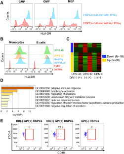 To determine whether antigen presentation by HLA-DR on hematopoietic stem progenitor cells (HSPCs) is involved in the development of acquired aplastic anemia (AA), we studied the HLA-DR expression on CD45dimCD34+CD38+ cells in the peripheral blood of 61 AA patients including 23 patients possessing HLA-class I allele-lacking (HLA-class I[−]) leukocytes. HLA-DR-lacking (DR[−]) cells accounted for 13.0–57.1% of the total HSPCs in seven (11.5%) patients with HLA-DR15 who did not possess HLA-class I(–) leukocytes. The incubation of sorted DR(–) HSPCs in the presence of IFN-γ for 72 h resulted in the full restoration of the DR expression. A comparison of the transcriptome profile between DR(–) and DR(+) HSPCs revealed the lower expression of immune response-related genes including co-stimulatory molecules (e.g., CD48, CD74, and CD86) in DR(–) cells, which was not evident in HLA-class I(–) HSPCs. DR(–) cells were exclusively detected in GPI(+) HSPCs in four patients whose HSPCs could be analyzed separately for GPI(+) and GPI(–) HSPCs. These findings suggest that CD4+ T cells specific to antigens presented by HLA-DR15 on HSPCs may contribute to the development of AA as well as the immune escape of GPI(–) HSPCs in a distinct way from CD8+ T cells recognizing HLA-class I-restricted antigens.