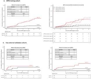 Current recommended risk scores to predict thrombotic events associated with myeloproliferative neoplasms (MPN) do not discriminate between arterial and venous thrombosis despite their different physiopathology. To define novel stratification systems, we delineated a comprehensive landscape of MPN associated thrombosis across a large long-term follow-up MPN cohort. Prior arterial thrombosis, age >60 years, cardiovascular risk factors and presence of TET2 or DNMT3A mutations were independently associated with arterial thrombosis in multivariable analysis. ARTS, an ARterial Thrombosis Score, based on these four factors, defined low- (0.37% patients-year) and high-risk (1.19% patients-year) patients. ARTS performance was superior to the two-tiered conventional risk stratification in our training cohort, across all MPN subtypes, as well as in two external validation cohorts. Prior venous thrombosis and presence of a JAK2V617F mutation with a variant allelic frequency ≥50% were independently associated with venous thrombosis. The discrimination potential of VETS, a VEnous Thrombosis Score based on these two factors, was poor, similar to the two-tiered conventional risk stratification. Our study pinpoints arterial and venous thrombosis clinico-molecular differences and proposes an arterial risk score for more accurate patients’ stratification. Further improvement of venous risk scores, accounting for additional factors and considering venous thrombosis as a heterogeneous entity is warranted.
