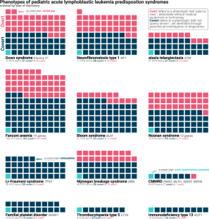 US editorialized all sections, and was primary writer for all sections not listed below. SI authored section on t21. SE and SJ co-wrote the “ATM & NBS” section. SJ also led the “FA & BSyn” section. HC and MS co-authored “NF1 & RAS”, with AB assisting. RK prepared the “CMMRD & LFS” section, and GC wrote “ETV6 & PAX5.” EF contributed the “IKFZ1 & RUNX1” section, with JT assisting. LL authored the “radio/chemosusceptibility” section, with TM and SJ assisting. LH, AP, KW assisted with structuring, editorializing, and literature review/checking. US generated graphical elements and associated code, with MM assisting. All authors reviewed and approved the final manuscript and contributed to revisions where applicable.